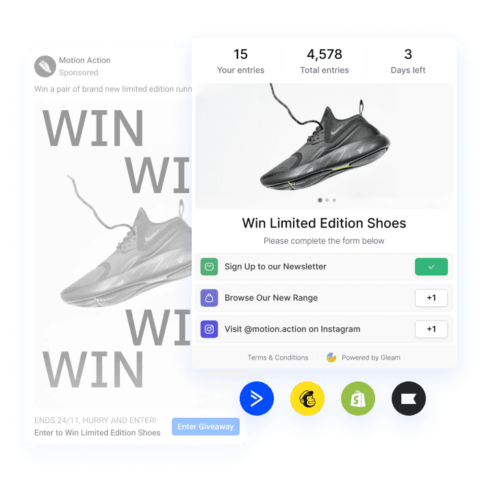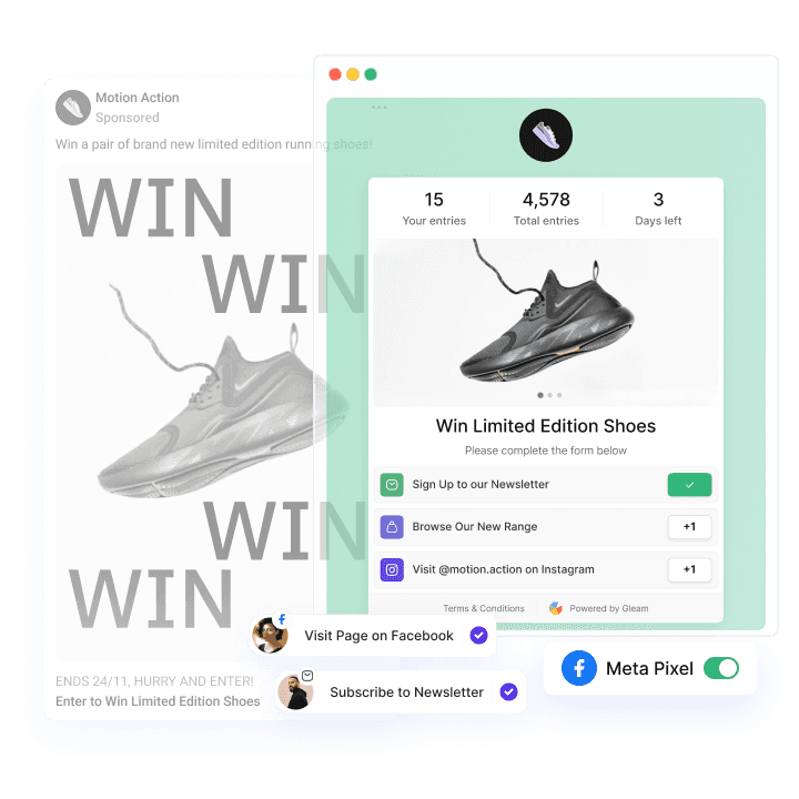 Transform your Facebook business page into a high-converting funnel. Gleam’s Facebook contest builder integrates directly with your marketing stack so you can grow your email list, reach your target audience, and turn likes into leads — instantly.