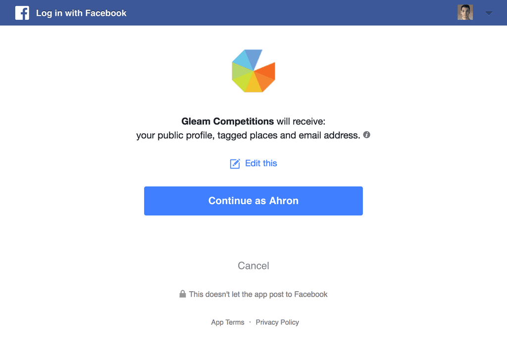 Social Logins: Gleam also allows Campaign Users to connect social accounts to your profile. Companies that have social logins enabled on their Campaigns will be able to see basic information related to accounts that you connect. This includes but is not limited to your name, email address, social profile URL's and associated profile photos.