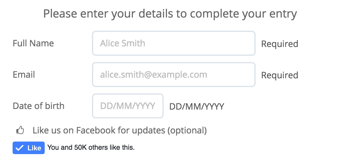 Some Campaigns may also require additional Custom Fields which include Date of Birth (for Age Verification) and other identifiable fields that the user can choose to fill out.